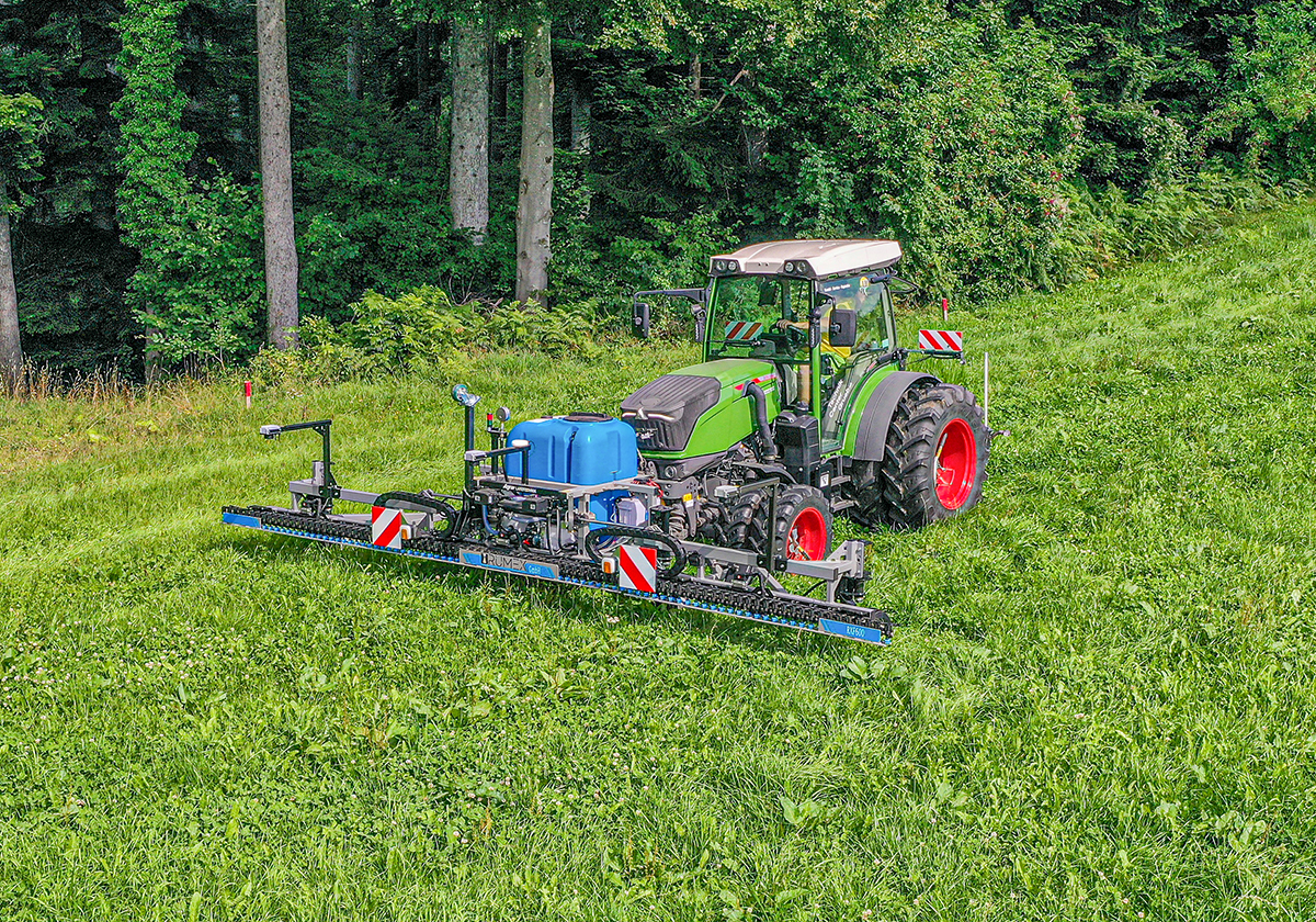 Le pulvérisateur automatique pour rumex peut être pris en charge par le relevage avant du tracteur. Grâce à trois caméras orientées horizontalement, la végétation des prairies est enregistrée durant le trajet. Ces données sont traitées par des algorithmes de calcul intelligents afin de pouvoir identifier clairement les plantes de rumex.