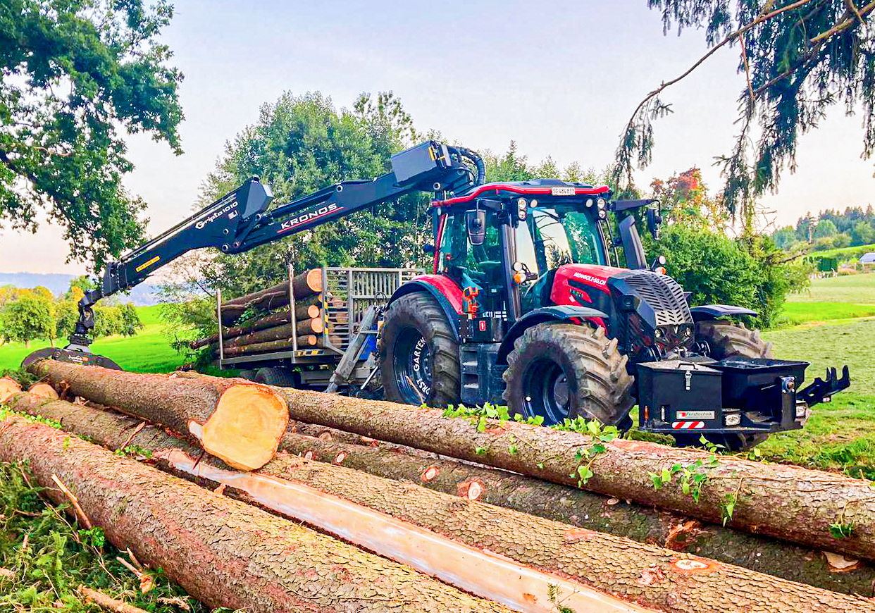 Ces travaux nécessitent des machines professionnelles, dont deux se distinguent particulièrement. D'une part, la fendeuse à bois mobile Posch, qui a remplacé la fendeuse à lame Hakki-Pilke en 2019. Elle permet de scier avec précision des troncs d'un diamètre allant jusqu'à 65 cm et de les fendre en bûches. D'autre part, un Valtra N175D, tracteur polyvalent pour la route et la forêt, qui peut également être utilisé pour le transport. Le tracteur est à la fois puissant et maniable. « Je voulais un produit haut de gamme. Chez Valtra, le point décisif a été que je pouvais déterminer exactement ce que je voulais », explique M. Heim pour justifier son choix. « De plus, on voit souvent de vieux Valtra qui sont toujours en service. Cela me montre que ces tracteurs sont également durables. » Grâce à Valtra Unlimited, il a pu équiper la machine en usine selon ses besoins, de la cabine forestière à la grue en passant par le logo de l'entreprise sur les jantes.